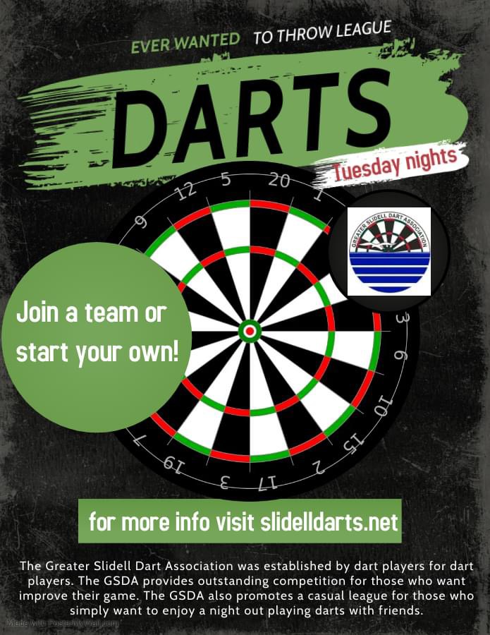 The Greater Slidell Dart Association was established by dart players for dart players. The GSDA provides outstanding competition for those who want improve their game. The GSDA also promotes a casual league for those who simply want to enjoy a night out playing darts with friends.
